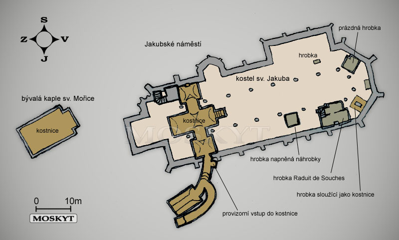V roce 2001 došlo v rámci průzkumu podzemí, u příležitosti architektonické úpravy Jakubského náměstí, k zajímavému objevu. První průzkumné sondy nejprve narazily pouhých třicet centimetrů pod úrovní vozovky na lidské ostatky z původních hrobů a naznačily tím možnost dalších překvapujících nálezů. Na místě, kde do roku 1785 stávala kaple sv. Mořice, odhalila půl metru pod povrchem další sonda rozlehlou podzemní kryptu, zcela zaplněnou lidskými kostmi. Potvrdil se tak předpoklad, vyplývající z některých historických pramenů, že zde byla vybudována jedna ze zapomenutých brněnských kostnic. Největší překvapení však čekalo na archeology jen o pár metrů dál, v bezprostřední blízkosti kostela sv. Jakuba.