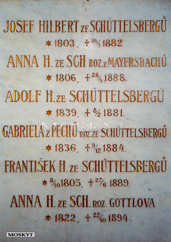 Ze dvou mramorových náhrobních desek zavěšených uvnitř kaple je možné vyčíst, že hrobka patřila rodině Schüttelsbergů. Z těchto do kamene vytesaných seznamů pohřbených, opatřených daty narození i úmrtí také vyplývá, že v hrobce bylo v rozmezí asi čtyřiceti let pochováno deset těl. Jak je ale vidět, ani velká a honosná kamenná hrobní kaple nezajistila zesnulým klid k věčnému odpočinku. Ještě nikdy jsem podobnou rodinou hrobku umístěnou takto o samotě neviděl. Je to bezesporu zajímavé a zvláštní místo. V dobách, kdy bylo rodinou udržováno, jistě vypadalo jako klidné, útulné a k věčnému spánku příhodné útočiště. Dnes však působí téměř strašidelně. Původní majitelé jistě předpokládali, že jejich potomci budou mít vždy dost prostředků a snahy kapli udržovat. Jak se však zdá, vše dopadlo jinak a stavba nákladné hrobky na samotě za vesnicí s odstupem času nevypadá zrovna jako nejšťastnější nápad.